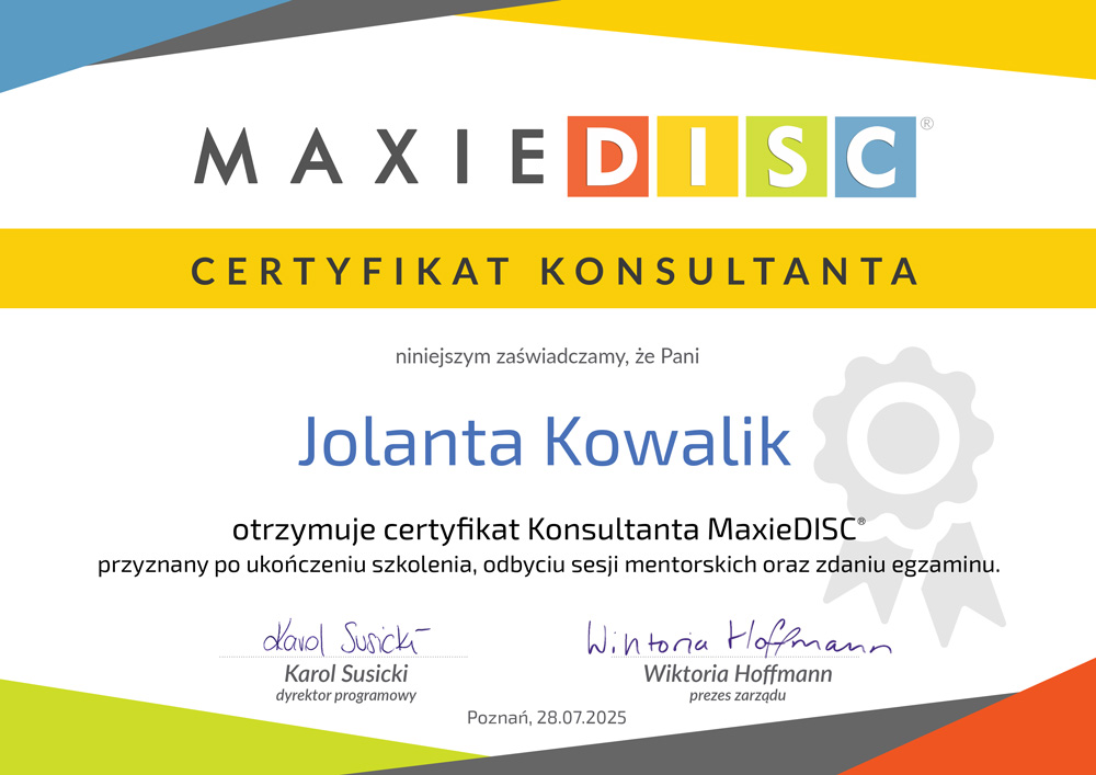 Jestem certyfikowaną konsultantką MAXIE DISC i trenerem biznesu, dzięki czemu potrafię nie tylko zinterpretować wynik, ale przełożyć go na realną zmianę w Twojej pracy, komunikacji i zespole. To nie tylko test – to początek zmiany!